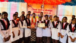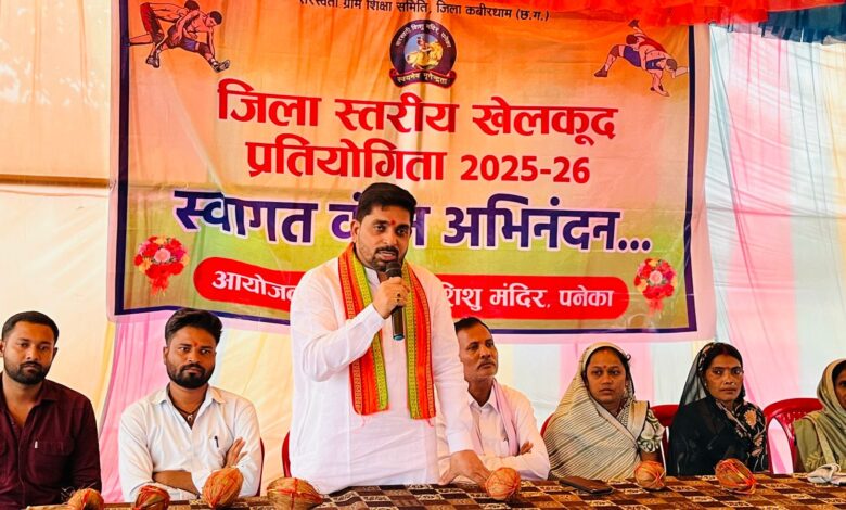 कवर्धा। सरस्वती ग्राम शिक्षा समिति जिला कबीरधाम द्वारा आयोजित जिला स्तरीय खेलकूद प्रतियोगिता 2025 का भव्य आयोजन ग्राम पनेका में किया गया। इस प्रतियोगिता के समापन एवं पुरस्कार वितरण कार्यक्रम में बतौर मुख्य अतिथि जिला पंचायत के सभापति डॉ. वीरेन्द्र साहू उपस्थित थे। प्रतियोगिता के प्रतिभागी बच्चों ने विभिन्न खेल प्रतिस्पर्धाओं में बढ़ चढ़कर हिस्सा लेते हुए अपनी खेल प्रतिभाओं का शानदर प्रदर्शन किया और स्थान बनाया। विजेता खिलाडिय़ों को प्रतियोगिता के समापन तथा पुरस्कार वितरण कार्यक्रम में मुख्य अतिथि श्री साहू द्वारा पुरस्कृत कर सम्मानित किया गया।