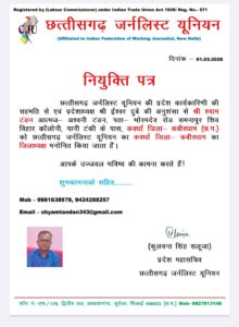 इस नियुक्ति से जिले के पत्रकारों में उत्साह का माहौल है। संगठन के पदाधिकारियों और पत्रकार साथियों ने श्याम टंडन को बधाई देते हुए उम्मीद जताई है कि उनके नेतृत्व में छत्तीसगढ़ जर्नलिस्ट यूनियन की गतिविधियां और अधिक सक्रिय होंगी तथा पत्रकारों के हितों को मजबूती से आगे बढ़ाया जाएगा।